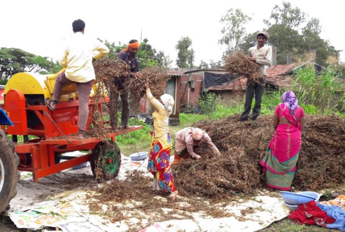 शिराळा परिसरात सोयाबीन पिकाच्या मळणीच्या कामात व्यस्त असलेली शेतकरी