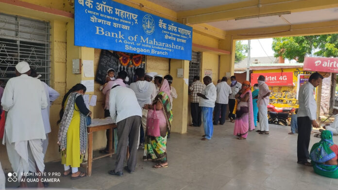 विनामास्क,सोशल डिस्टसिंगचा फज्जा उडाला आहे.बँकेकडूनही कोणतीही खबरदारी घेतली जात नाही.शेगाव येेथेही कोरोनाचा धोका कायम आहे.राष्ट्रीयकृत्त बँक असल्याने आसपासच्या गावातूनही अनेक नागरिक येथे येतात.त्यामुळे शेगावकर भितीच्या छायेत आहेत.बँकेनी याबाबत काळजी घ्यावी,अशी मागणी होत आहे.