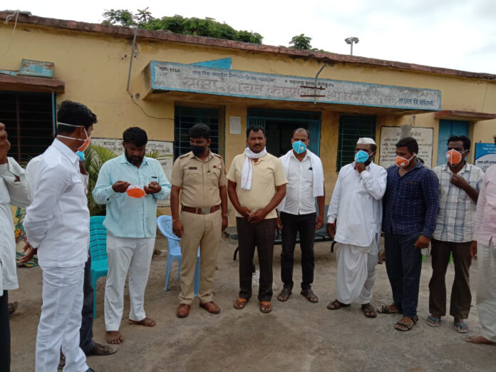 आंसगी तुर्क ता.जत येथे जि.प निधीतून मास्कचे वाटप करताना उपनिरिक्षक नामदेव दांडगे,सरदार पाटील