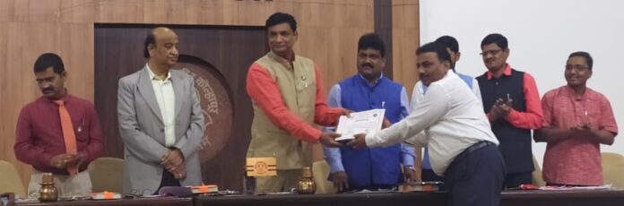 जत : राष्ट्रीय सेवा योजना विभागाचा पुरस्कार मा. कुलगुरू डाॅ. देवानंद शिंदे यांचे हस्ते स्विकारताना डाॅ. राजेंद्र लवटे