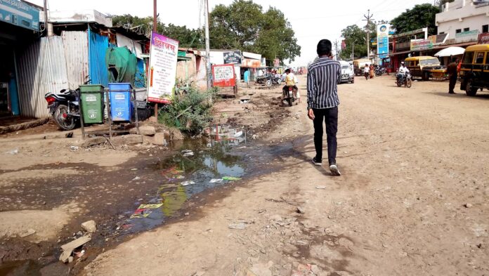जत शहरातील विजापूर-गुहागर रस्त्यावरून वाहणारे गटारीचे दुर्गंधीयुक्त पाणी