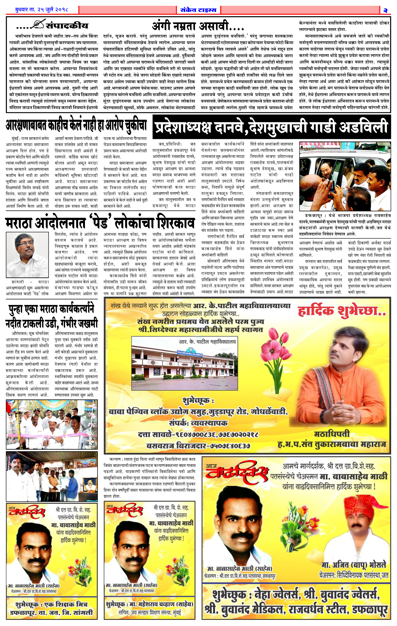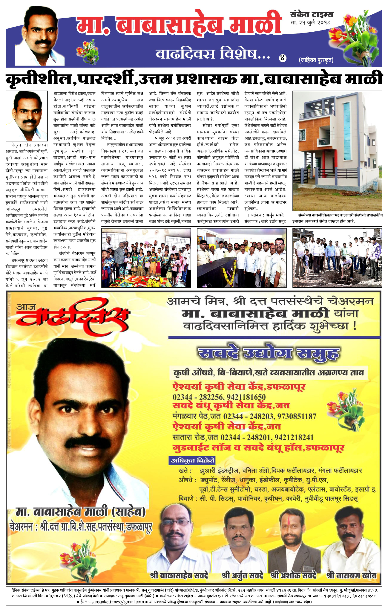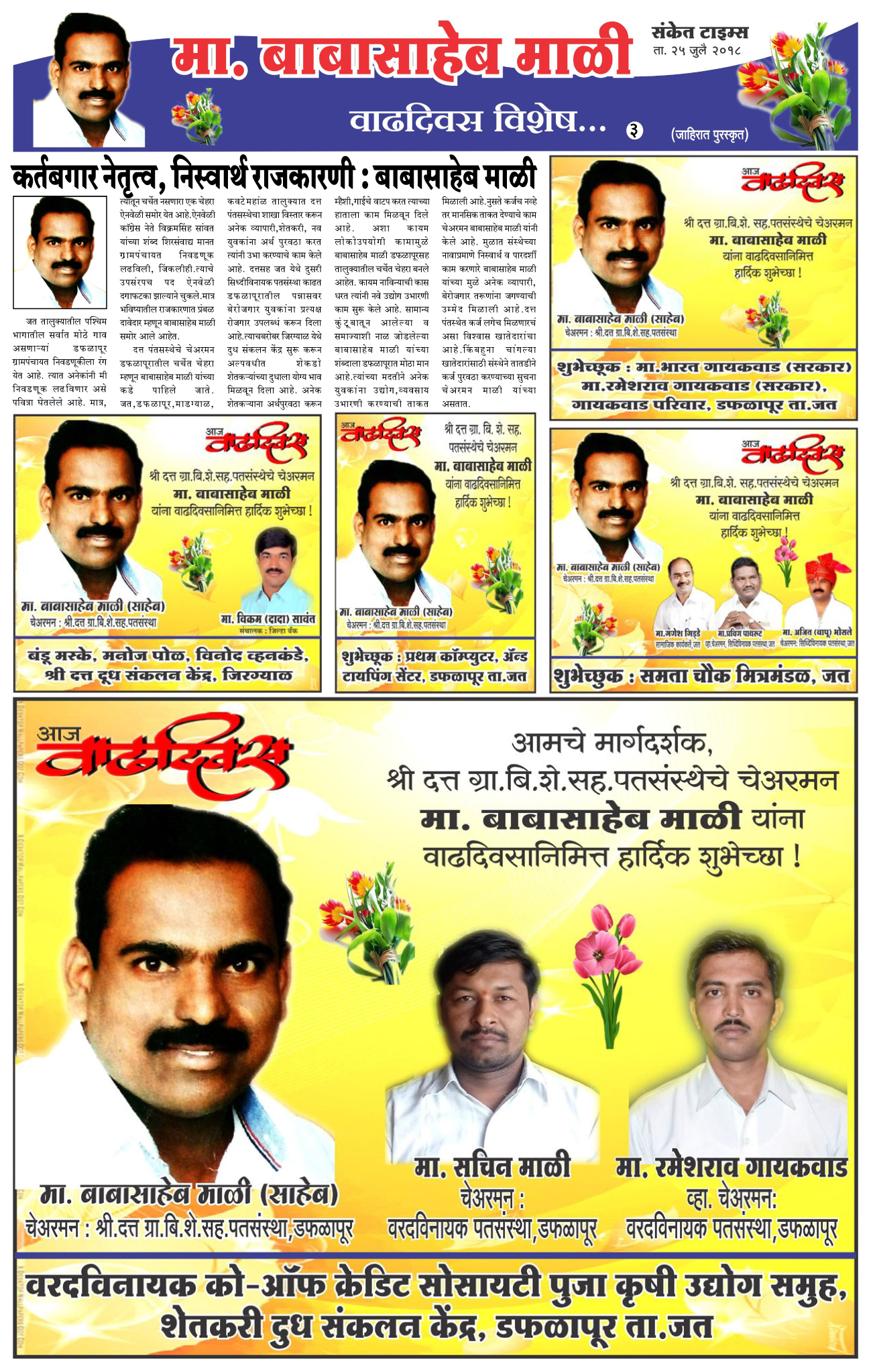 सोळा वर्षापुर्वी एका सामान्य युवकांनी संस्था काढण्याचे धाडस केले होते.त्यावेळी अनेक अडचणी,आर्थिक ससेलोट,कोणतीही अनुकूल परिस्थिती नसतानाही निव्वळ संस्थापक चेअरमन बाबासाहेब माळी यांच्या कृतृत्वाने संस्थेला आज हे वैभव प्राप्त झाले आहे. संस्थेच्या सध्या चार शाखात मिळून 55 बेरोजगार तरूणांच्या हाताला काम मिळाले आहे. त्याचबरोबर हाजारो व्यवसायिक,छोटे उद्योगांना कर्जपुरवठा करून त्यांना उभारी देण्याचे काम संस्थेने केले आहे. गेल्या सोळा वर्षात हाजारो व्यवसायिकांची अर्थवाहिनी म्हणून श्री.दत्त पतसंस्थेला नावलौकिक मिळाला आहे. जेथे बँकाना जमले नाही तेथे दत्त पतसंस्थेने करून दाखविले आहे.डफळापूर, कवटेमंहकाळ, जत परिसरातील अनेक व्यवसायिकांना आधार ठरणारी ही संस्था आज माडग्याळ शाखेच्या माध्यमातून तालुकाभर कार्यक्षेत्र विस्तारले आहे.या मागे मजबूत पणे करणारे बाबासाहेब माळी हे महत्वाचे हस्ती म्हणून नावारूपास आले आहेत. त्यांचा आज वाढदिवस त्यानिमित्त त्यांना आभाळभर शुभेच्छा…
