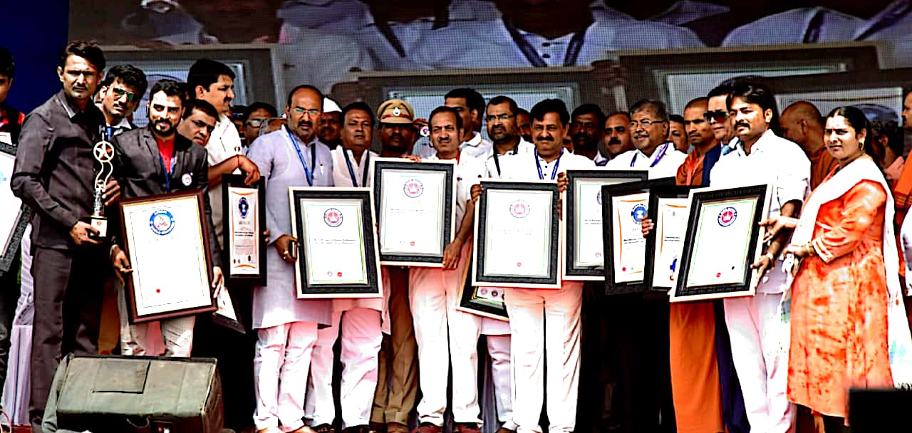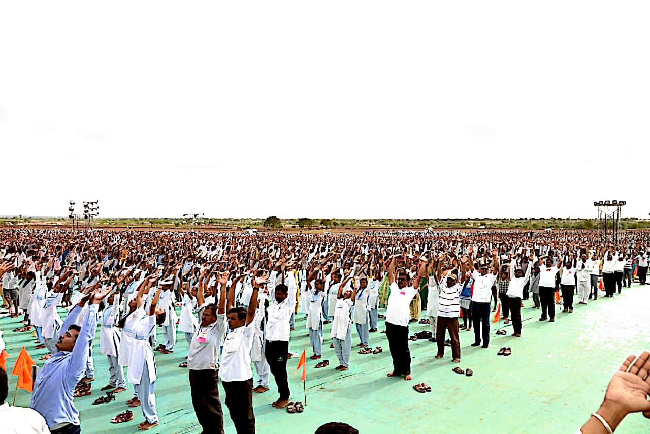 सांगली : सांगली जिल्ह्यात जत तालुक्यातील बालगाव येथे जिल्हा प्रशासन व गुरूदेवाश्रम बालगाव यांच्या संयुक्त विद्यमाने आंतरराष्ट्रीय योग दिनानिमित्त आयोजित ऐतिहासिक योग शिबिरात सुमारे 1 लाख 10 हजार योगप्रेमींनी सहभाग घेऊन सूर्यनमस्कार योगसाधना केली. या ऐतिहासिक क्षणाची नोंद जागतिक मान्यताप्राप्त एशियन बुक ऑफ वर्ल्ड रेकॉर्ड, मार्व्हलस बुक ऑफ वर्ल्ड रेकॉर्ड, हाय रेंज बुक ऑफ वर्ल्ड रेकॉर्ड या तीन ठिकाणी झाली आहे. सर्वाधिक लोकांनी एकत्र येवून सूर्यनमस्कार योग साधना करण्याचा हा ऐतिहासिक क्षण असल्याच्या शब्दात वर्ल्ड बुक रेकॉर्डच्या प्रतिनिधींनी मोहोर उमटवली. यावेळी वर्ल्ड रेकॉर्डच्या अधिकृत प्रतिनिधींनी याबाबतचे प्रमाणपत्र व सुवर्ण पदके सन्मानपूर्वक महसूलमंत्री चंद्रकांत पाटील, पालकमंत्री सुभाष देशमुख, कृषी राज्यमंत्री सदाभाऊ खोत, जिल्हाधिकारी वि. ना. काळम, निवासी उपजिल्हाधिकारी त्रिगुण कुलकर्णी व अन्य उपस्थितांना समारंभाच्या शेवटी प्रदान केली.