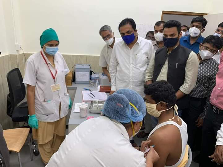 सांगली : कोरोना लसीकरणाच्या पहिल्या टप्प्याचा शुभारंभ पालकमंत्री जयंत पाटील यांच्याहस्ते करण्यात आला. इस्लामपूर उपजिल्हा रुग्णालय येथील आरोग्य कर्मचारी गोरखनाथ चंदणशिवे यांना सिरमची कोव्हीशिल्ड ही पहिली लस देण्यात आली.
